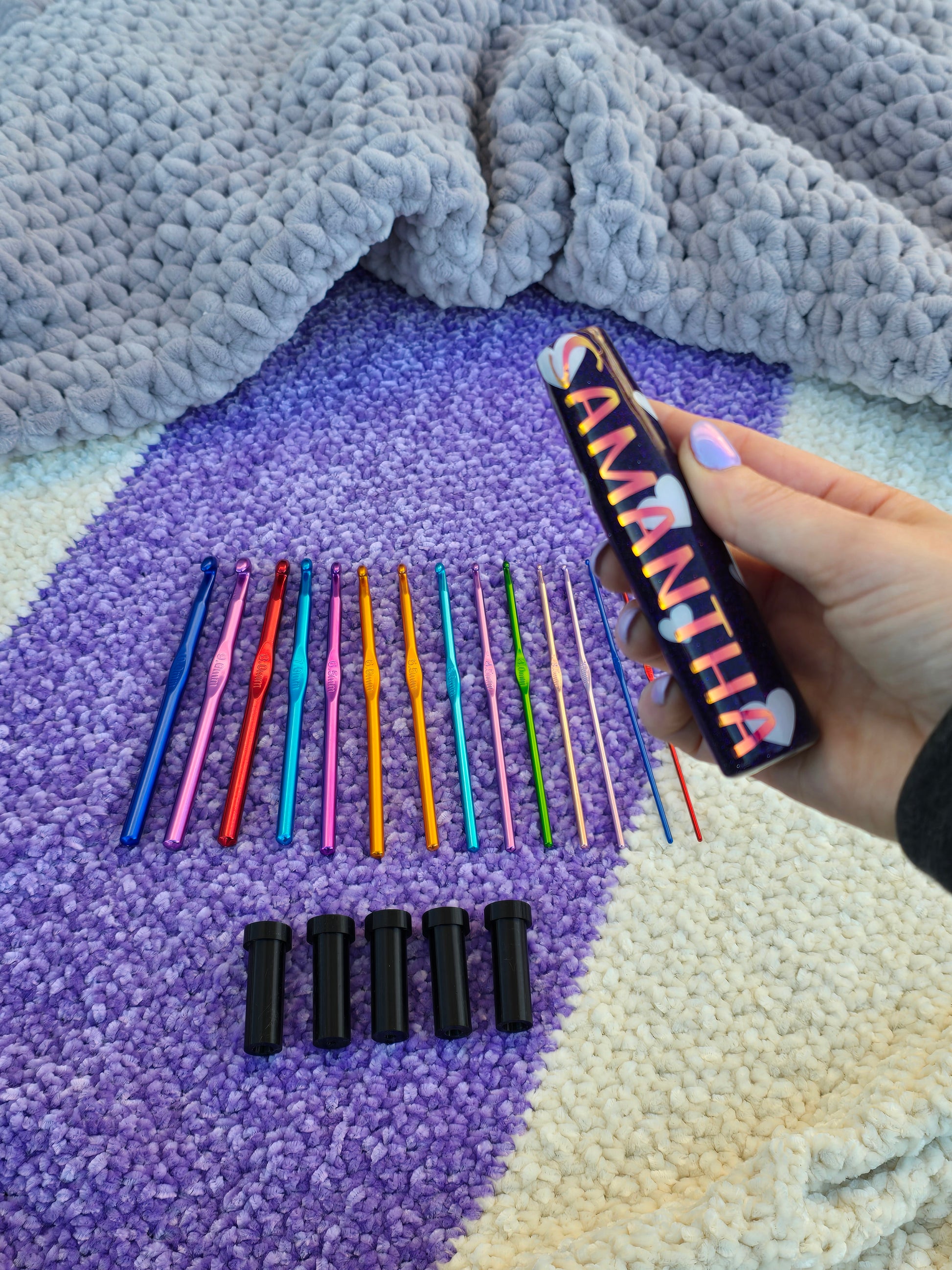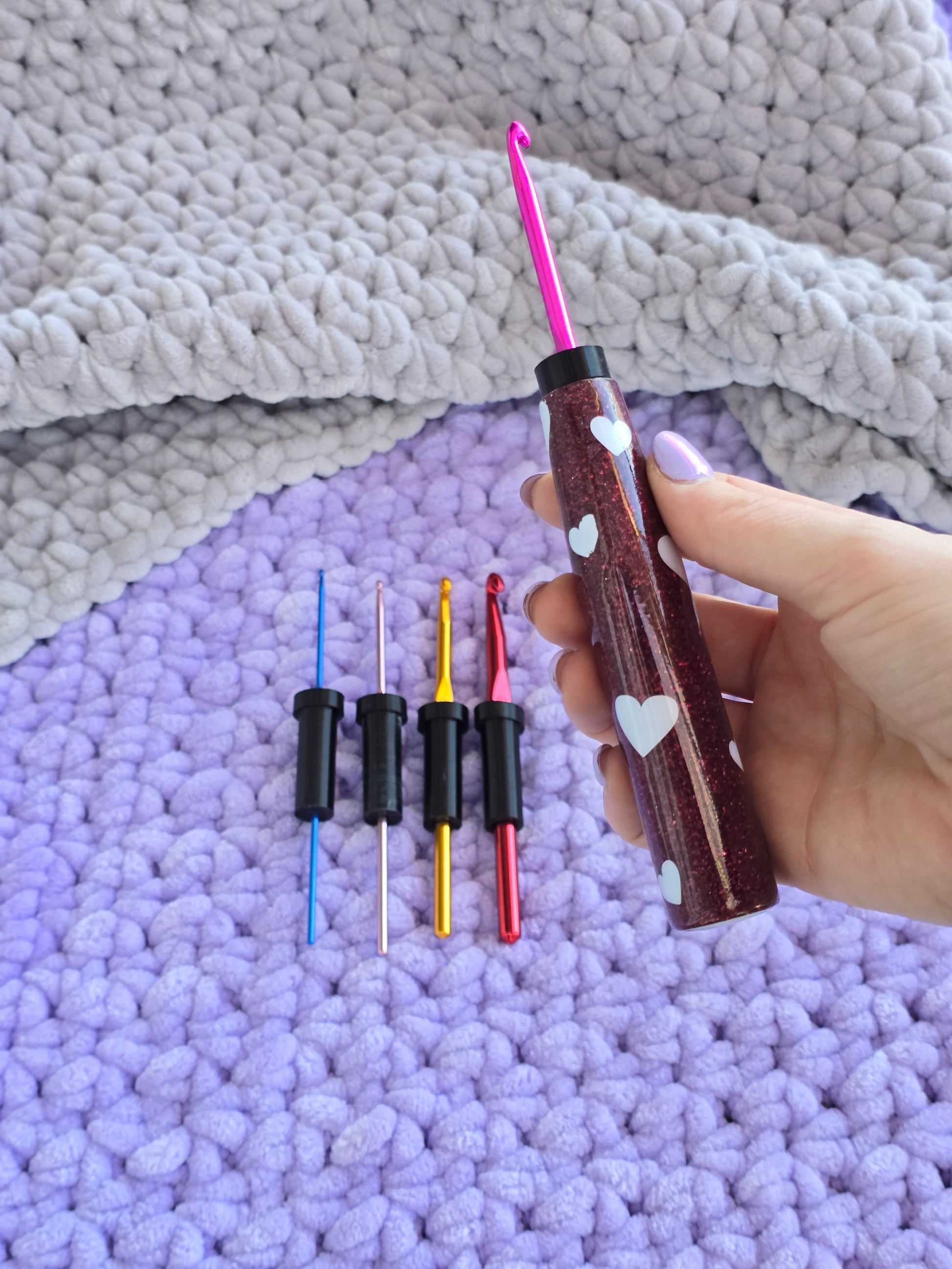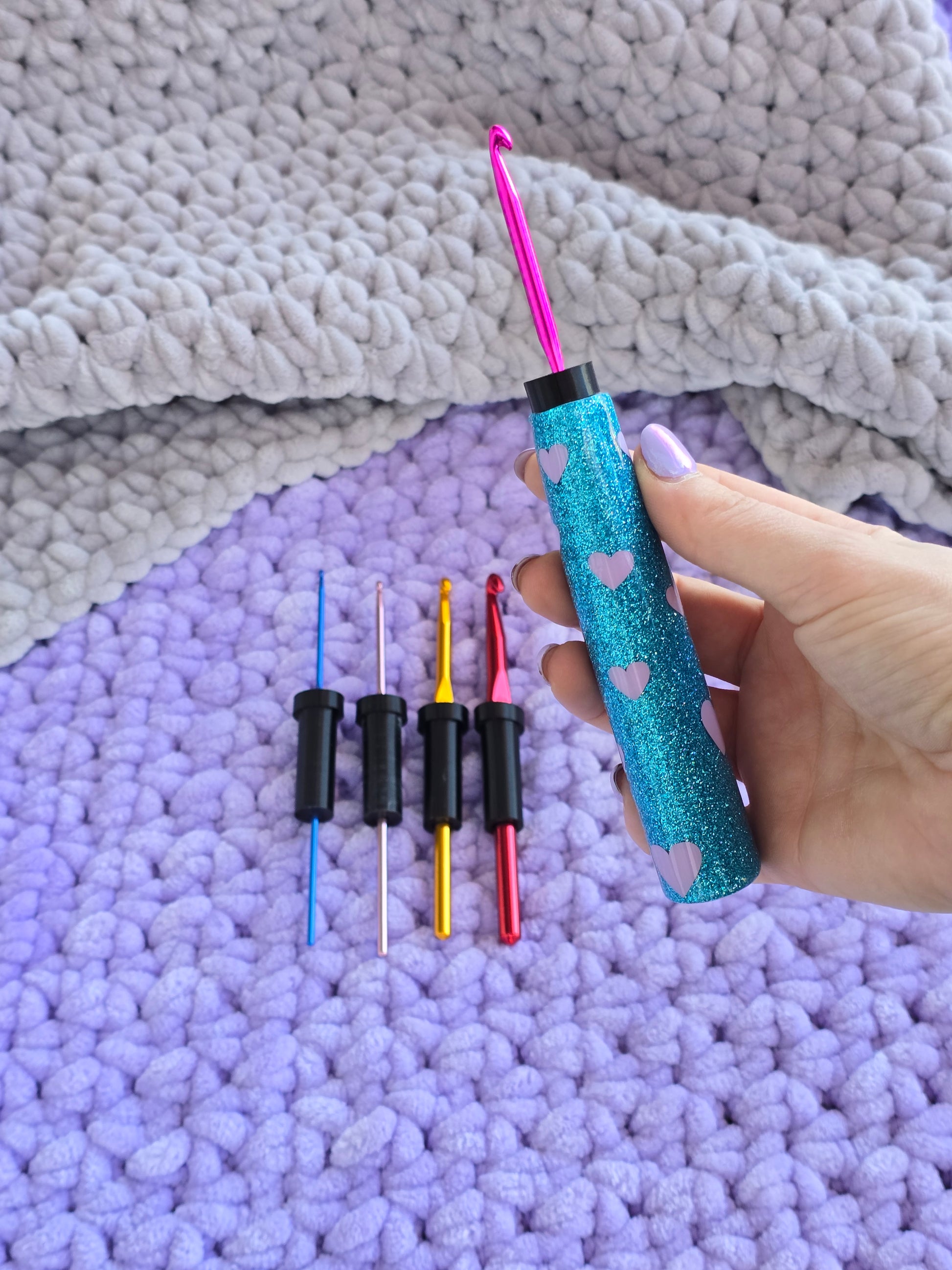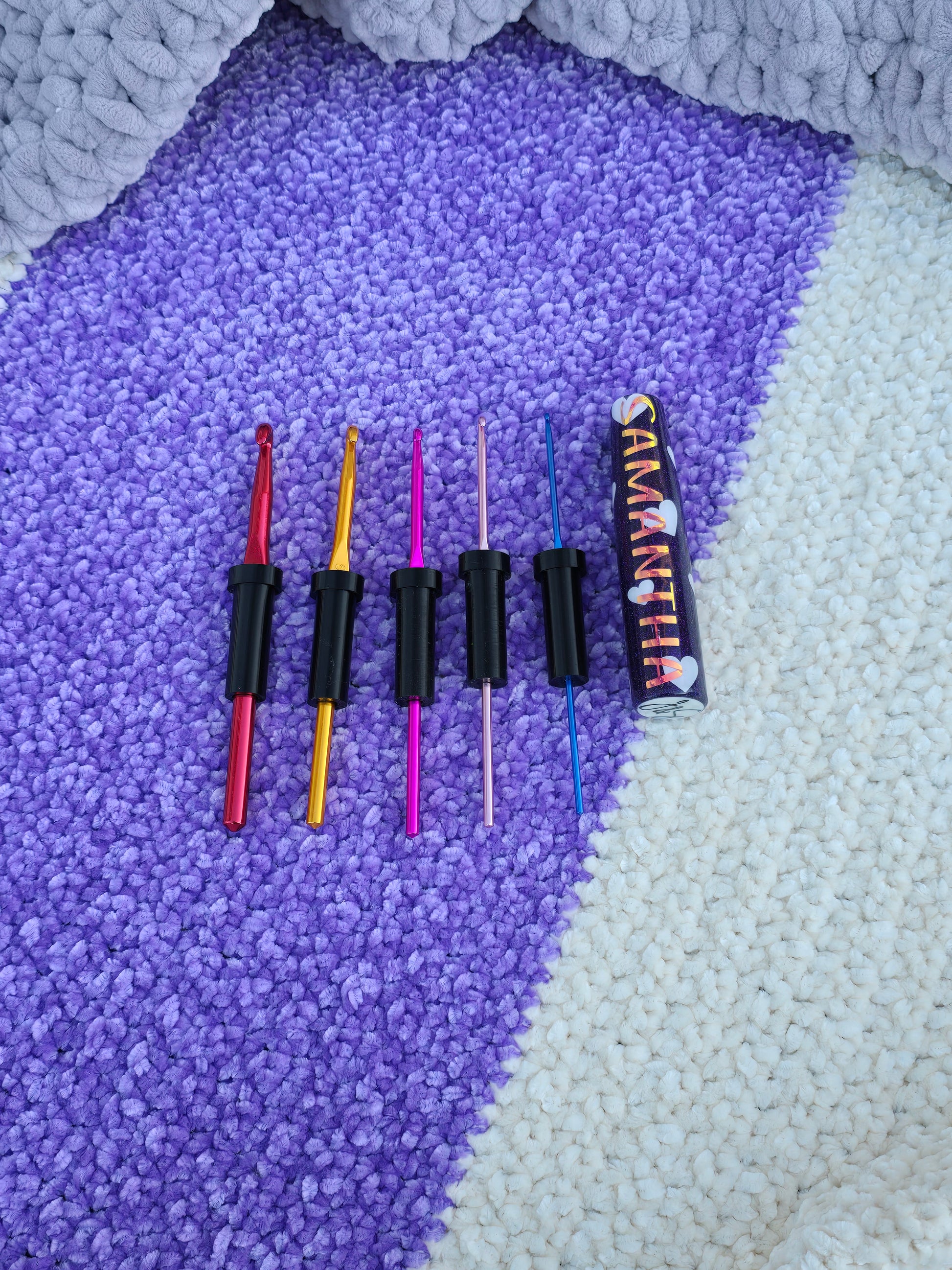 The CrogoHandle - an ERGONGOMIC CROCHET HANDLE, with inserts to fit multiple hook sizes.